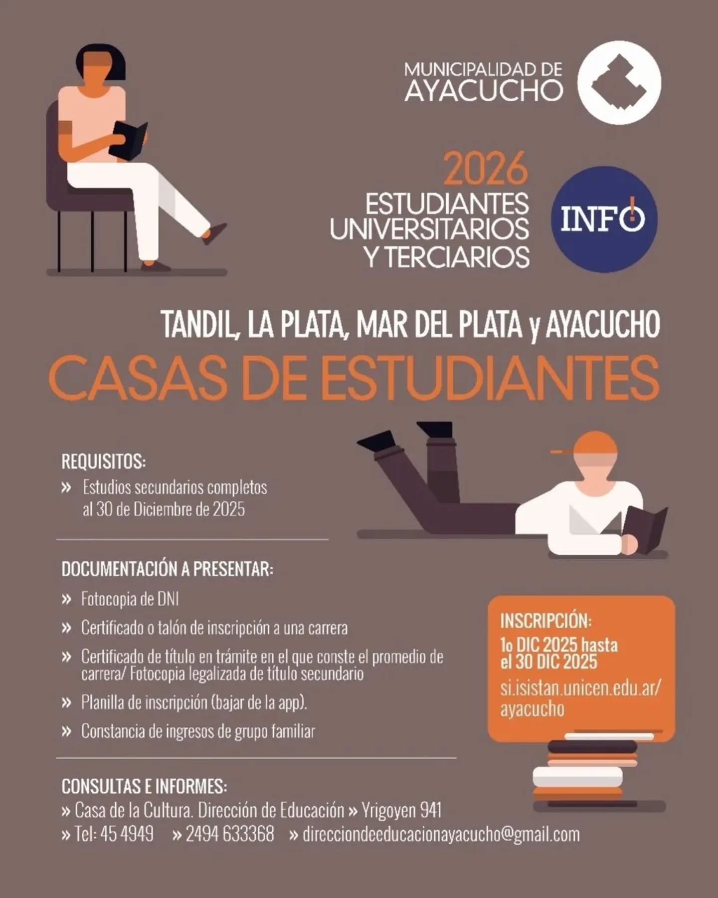 La Municipalidad de Ayacucho a travรฉs de la Secretarรญa de Educaciรณn lanza la inscripciรณn 2026 para las Becas Econรณmicas de Estudio y las Casas de Estudiantes.