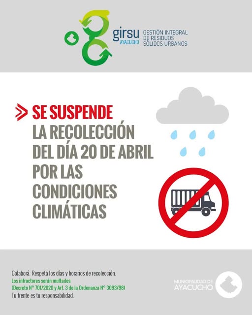 Debido a las condiciones climΓ‘ticas, se informa que hoy 20 de abril queda suspendido el servicio de recolecciΓ³n de residuos.
