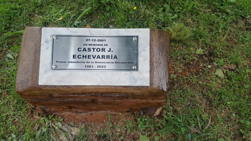 En torno a las 11 hs. de ayer se realizó un breve y emotivo acto bajo el ginko biloba situado en Plaza San Martín, árbol oportunamente plantado en su memoria y a cuyo pie se redescubrió una placa recordatoria del primer Intendente Municipal elegido por el pueblo con la reinstauración de la democracia a partir de 1983, Castor Joaquín “Tuco” Echevarría.