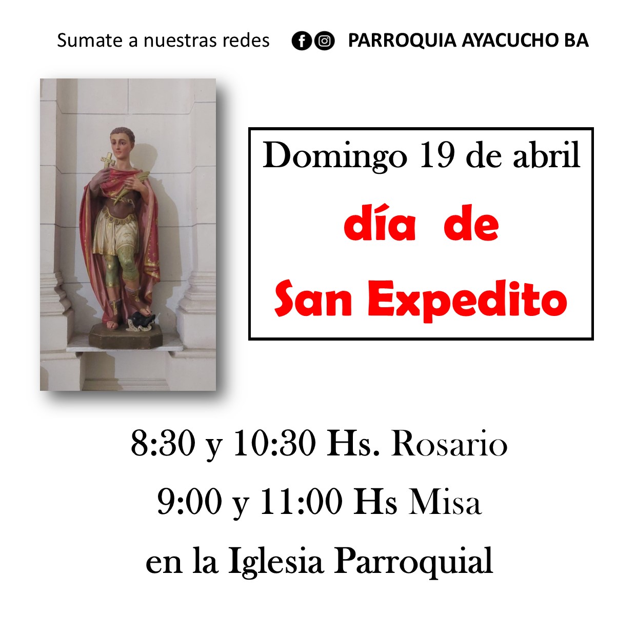 La Semana que viene se realizarán dos eventos relevantes. Uno, el domingo 19 de abril es la festividad de San Expedito. Santo al cual se encomiendan muchas personas.