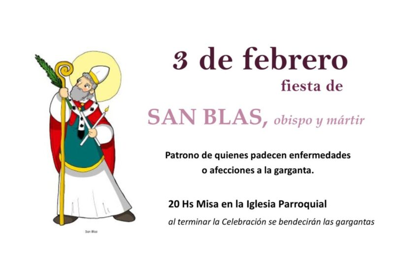 El lunes 3 de febrero fiesta de San Blas, al terminar la Misa de las 20, se bendecirán las gargantas.