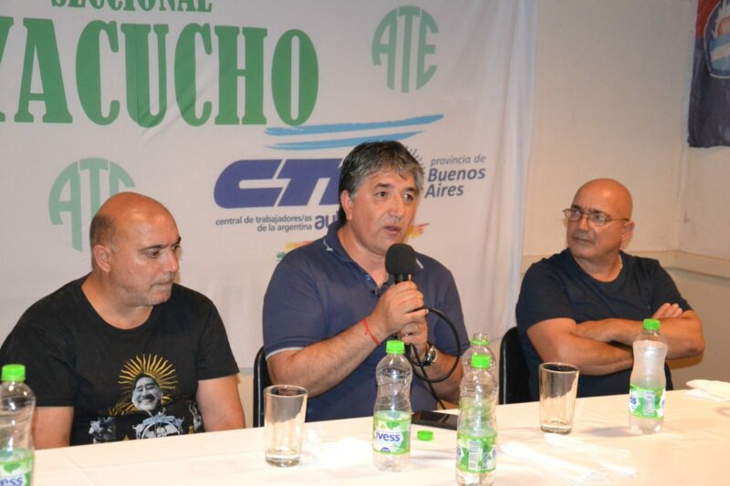 El Secretario General de ATE Ayacucho, Dr. Alejandro Corvalán, tomó la palabra en el inicio del evento, quien además de agradecer al Secretario General de Centro de Empleados de Comercio, Osvaldo Zétola por haber cedido el espacio físico, sostuvo que “desde el 10 de diciembre sabíamos lo que iba a pasar. Hoy necesitamos que los representantes del pueblo en la Legislatura no traicionen a los trabajadores” remarcó.