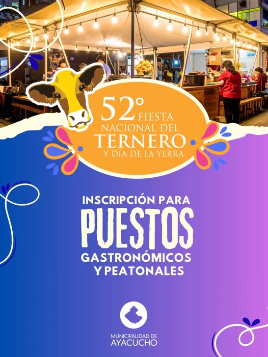 La Municipalidad de Ayacucho a través de la oficina de Habilitación de Comercio e Industria comunica que en el marco de la 52° Fiesta Nacional del Ternero y Día de la Yerra, se cumplirá el siguiente cronograma de recepción de solicitudes para 𝗵𝗮𝗯𝗶𝗹𝗶𝘁𝗮𝗰𝗶𝗼𝗻𝗲𝘀 𝗺𝘂𝗻𝗶𝗰𝗶𝗽𝗮𝗹𝗲𝘀 𝗱𝗲 𝘃𝗲𝗻𝘁𝗮 𝗱𝗲 𝗴𝗮𝘀𝘁𝗿𝗼𝗻𝗼́𝗺𝗶𝗰𝗼𝘀 (en todas sus categorías), y 𝗽𝘂𝗲𝘀𝘁𝗼𝘀 𝗽𝗲𝗮𝘁𝗼𝗻𝗮𝗹𝗲𝘀.