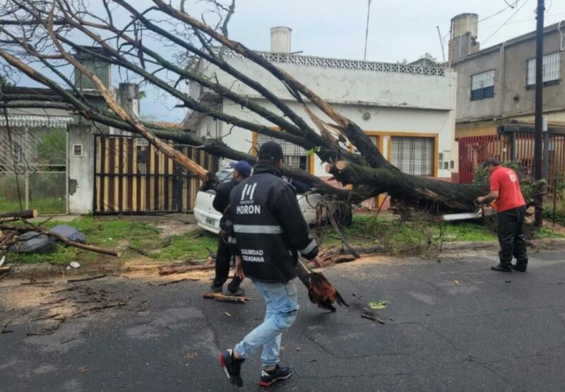 Personal municipal retira un tronco que cayó sobre un vehículo en Morón. (@MunicipioMoron)
