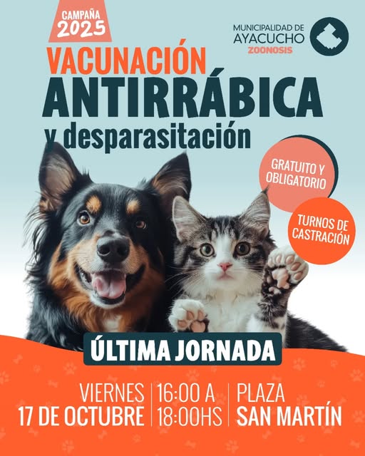 GENERALrotador El viernes 17, última jornada de Vacunación antirrábica 3 octubre, 2025 FacebookTwitterPinterestWhatsApp Nueva fecha para la realización de la última jornada del programa de vacunación antirrábica y desparasitación 2025. Viernes 17 de octubre en Plaza San Martín desde las 16 horas.