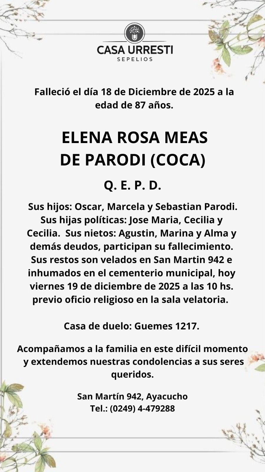 SOCIALESDEFUNCIONES Elena Rosa Meas de Parodi ( Coca) 19 diciembre, 2025 FacebookTwitterPinterestWhatsApp
