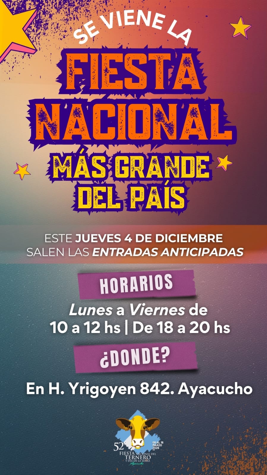 Con buena demanda, dada la excelencia de los números artístivos contratados por la comisión de la Asociación Fiesta Nacional del Ternero, que se harán presentes en la 52 edición de marzo 2026, continúa la venta de entradas anticipadas.