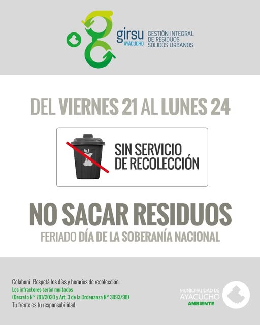 Del viernes 21 al lunes 24, con motivo del feriado por el Día de la Soberanía Nacional, no habrá servicio de recolección de residuos.