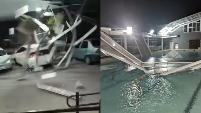 Las imágenes que comenzaron a circular pasadas las 23:00 horas son elocuentes. Publicaciones de “El Mirador Noticias” y “Radiante Informa” muestran cómo parte de la estructura del techo de la pileta municipal colapsó sobre el agua.