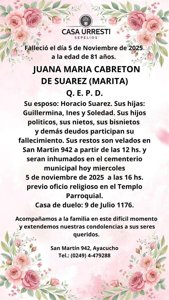 SOCIALESDEFUNCIONES Juana María Cabretón de Suárez ( Marita) 5 noviembre, 2025 FacebookTwitterPinterestWhatsApp