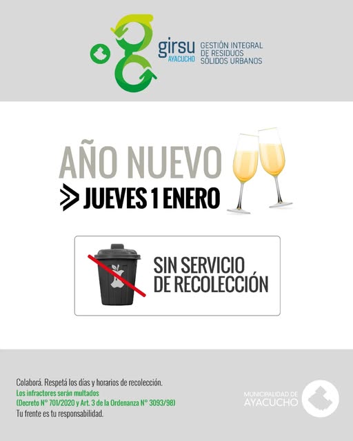 GENERALrotador Jueves 1° de enero Año Nuevo 30 diciembre, 2025 FacebookTwitterPinterestWhatsApp NO habrá servicio de recolección de residuos Colaborá con la limpieza de la ciudad. Respetá los días y horarios habituales. No saques los residuos ese día. Tu frente es tu responsabilidad. Entre todos cuidamos Ayacucho