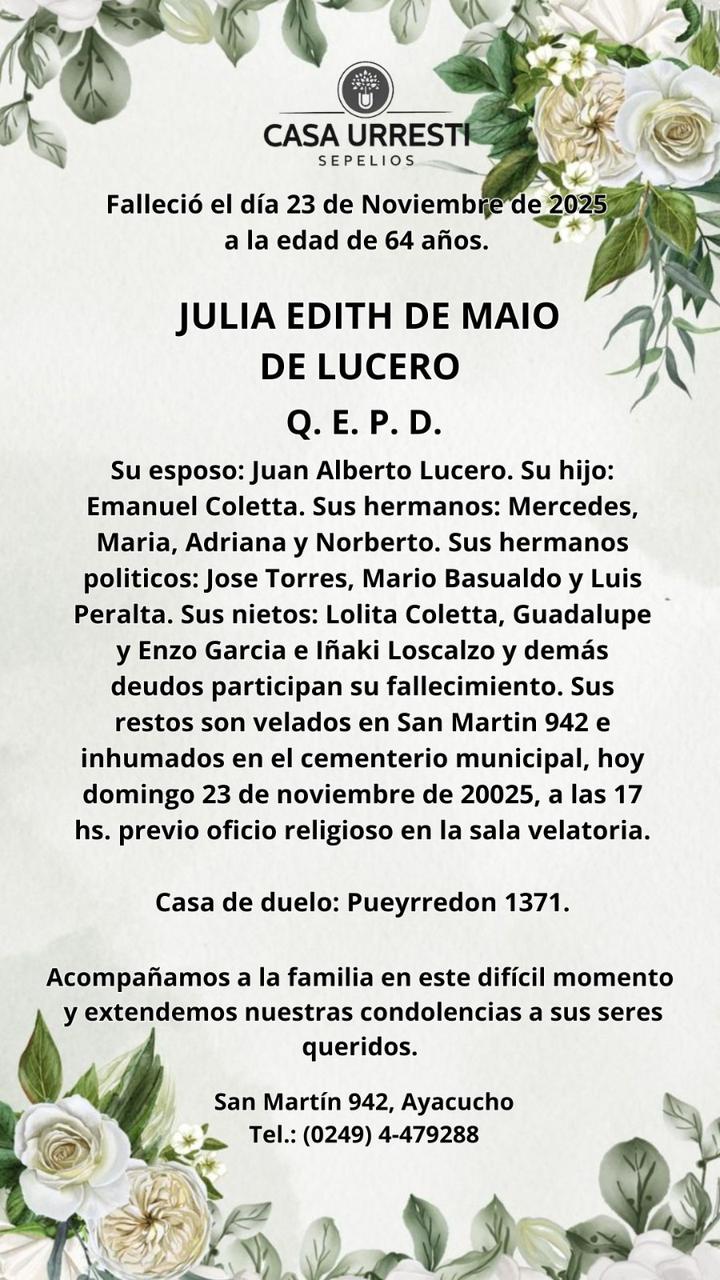 SOCIALESDEFUNCIONES Julia Edith de Maio de Lucero 23 noviembre, 2025 FacebookTwitterPinterestWhatsApp