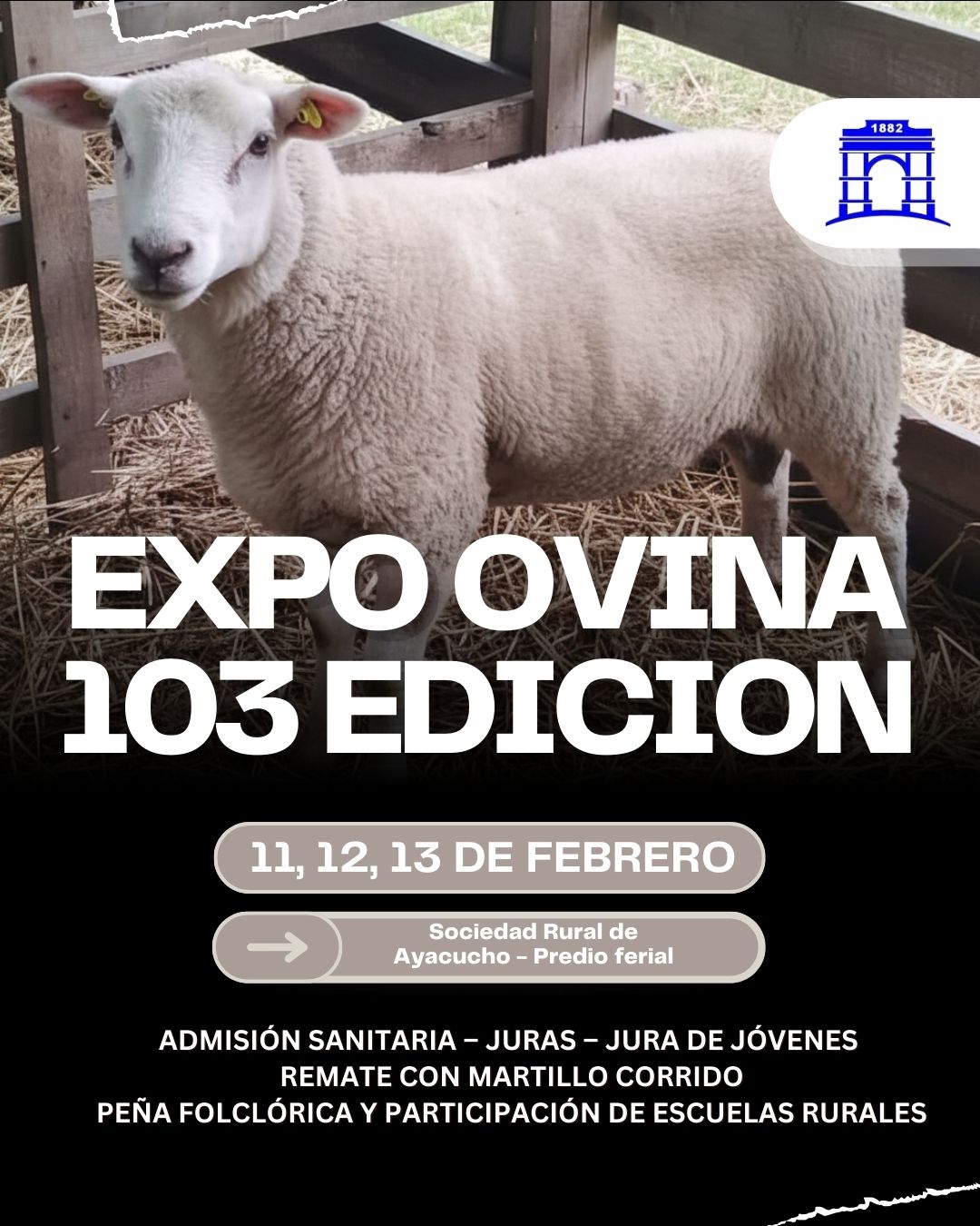 La Sociedad Rural de Ayacucho anunció la realización de la 103ª Exposición de Reproductores Ovinos, que se desarrollará de manera ininterrumpida los días miércoles 11, jueves 12 y viernes 13 de febrero de 2026, en el predio ferial de la institución.