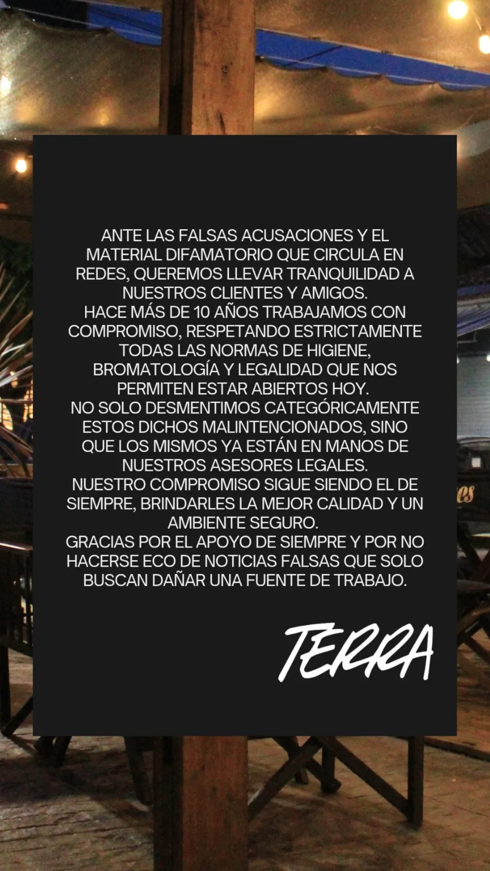 En el texto, aseguran: “Ante las falsas acusaciones y el material difamatorio que circula en redes, queremos llevar tranquilidad a nuestros clientes y amigos. Hace más de 10 años trabajamos con compromiso, respetando estrictamente todas las normas de higiene, bromatología y legalidad que nos permiten estar abiertos hoy”.