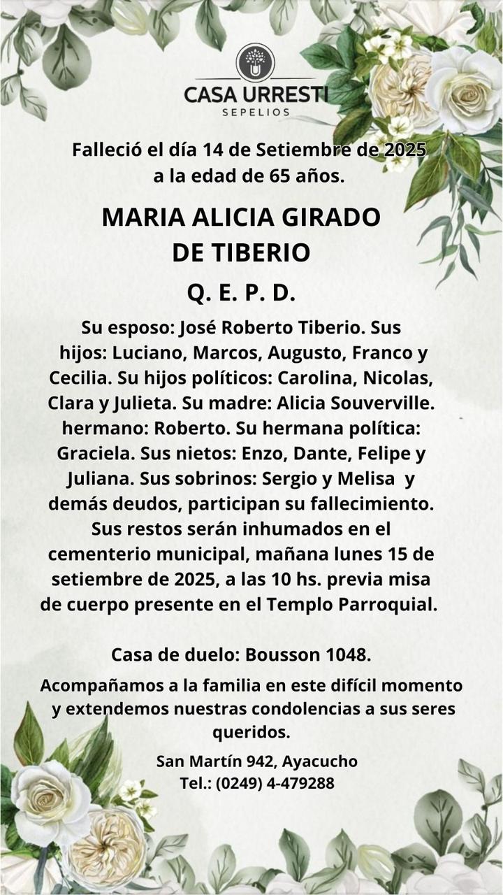 SOCIALESDEFUNCIONES Maria Alicia Girado de Tiberio 14 septiembre, 2025 FacebookTwitterPinterestWhatsApp