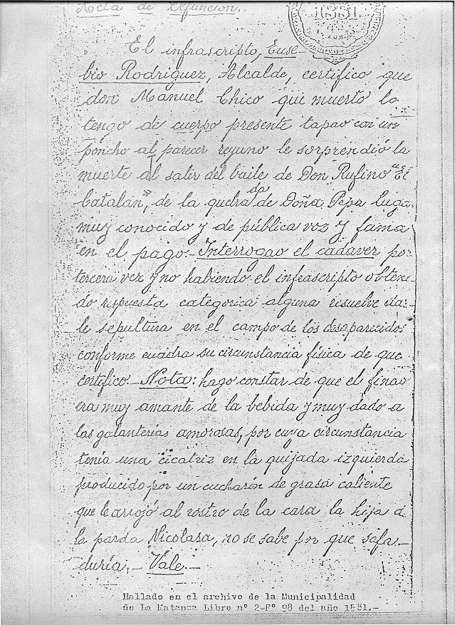 El infrascripto, Eusebio Rodríguez, Alcalde, certifico que Don Manuel Chico, que muerto lo tengo de cuerpo presente tapao con un poncho al parecer reyuno le sorprendió la muerte al salir del baile de Don Rufino, “El Catalán”, de la quebrada de Doña Pepa, lugar muy conocido y de pública voz y fama en el pago. Interrogao el cadáver por tercera vez y no habiendo el infraescripto obtenido respuesta categórica alguna resuelve darle sepultura en el campo de los desaparecidos, conforme cuadra su circunstancia física de que certifico. Nota: Hago constar de que el finao era muy amante de la bebida y muy dado a las galanterías amorosas, por cuya circunstancia tenía una cicatriz en la quijada izquierda producida por un cucharón de grasa caliente que le arrojó al rostro de la cara la hija de la parda Nicolasa, no se sabe por qué zafadurías. Vale. –