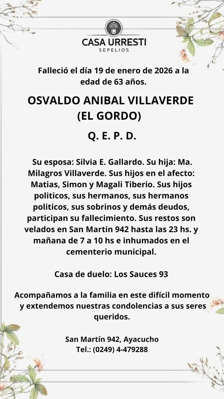 SOCIALESDEFUNCIONES Osvaldo Anibal Villaverde ( Gordo) 19 enero, 2026 FacebookTwitterPinterestWhatsApp
