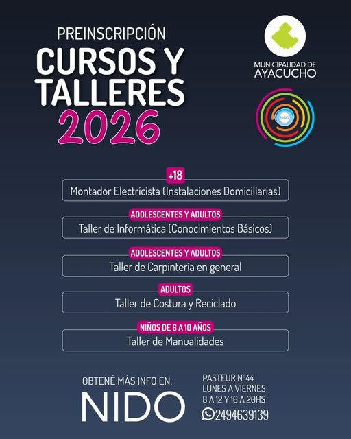 La Municipalidad de Ayacucho informa que ya se encuentra abierta la preinscripción para los cursos y talleres 2026 en el espacio NIDO