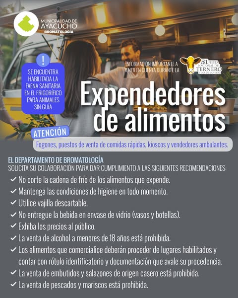 GENERALrotador Recomendaciones Bromatológicas en esta Fiesta 11 marzo, 2025 FacebookTwitterPinterestWhatsApp El Departamento de Bromatología de la Municipalidad de Ayacucho hace extensiva una serie de recomendaciones dirigidas a expendedores y consumidores de alimentos, durante el desarrollo de la 51° Fiesta Nacional del Ternero y Día de la Yerra.