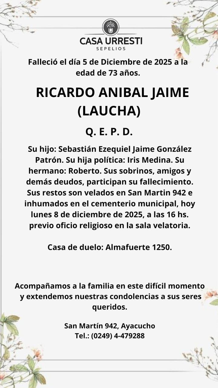 SOCIALESDEFUNCIONES Ricardo Anibal Jaime ( Laucha) 8 diciembre, 2025 FacebookTwitterPinterestWhatsApp