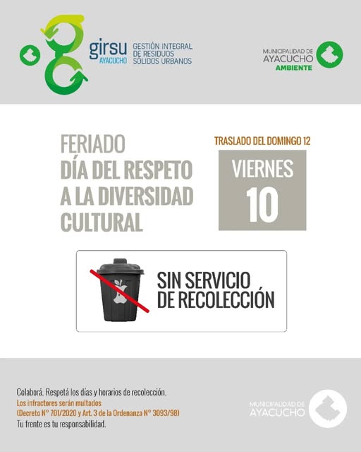 Con motivo del traslado del feriado por el Día del Respeto a la Diversidad Cultural, el servicio de recolección de residuos no se realizará este viernes 10 de octubre.